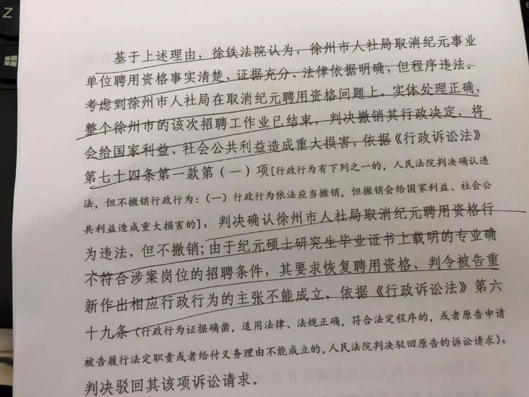 判決書中提到:“判決撤銷人社局行政決定,將會給國家利益、社會公共利益造成重大損害。”并最終依據《行政訴訟法》相關法條,判決確認徐州市人社局取消紀元聘用資格行為違法,但不撤銷。