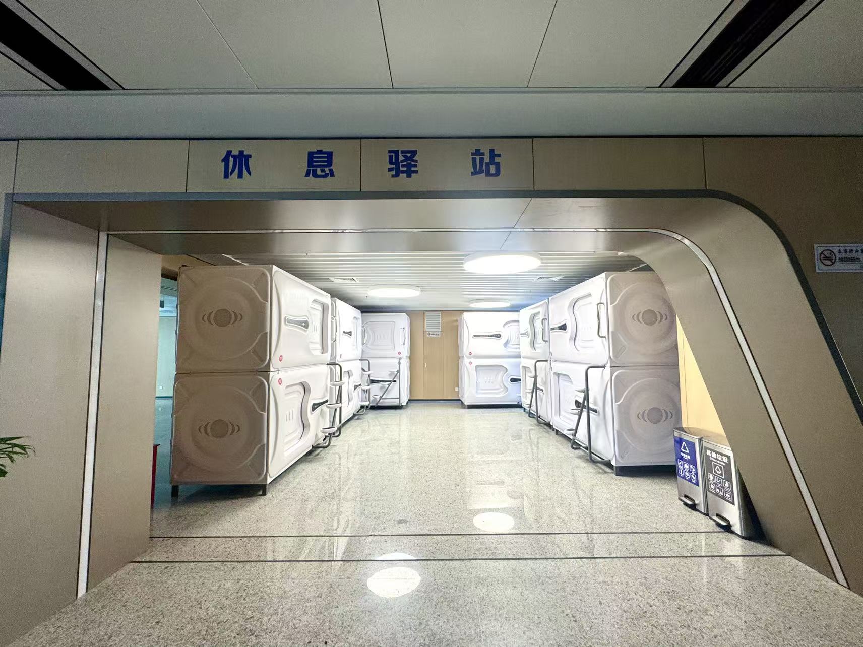 休息驛站內(nèi)的“太空艙”內(nèi)部空間設(shè)計合理,最大尺寸為長2.2米、寬0.9米、高1.6米。每個艙內(nèi)被褥整潔,設(shè)施完善,配備了LED照明鏡、閱讀燈、USB充電口、換風(fēng)循環(huán)系統(tǒng)及空氣凈化系統(tǒng),充分考慮到使用者的舒適與便利。同時,為確保安全,艙內(nèi)安裝了滅火器、煙霧報警器等消防設(shè)施。醫(yī)院還安排了專職保潔人員,定期對艙內(nèi)外環(huán)境進行清潔和消毒,并嚴格執(zhí)行“一人一換”的被褥用品管理制度,保障衛(wèi)生條件。