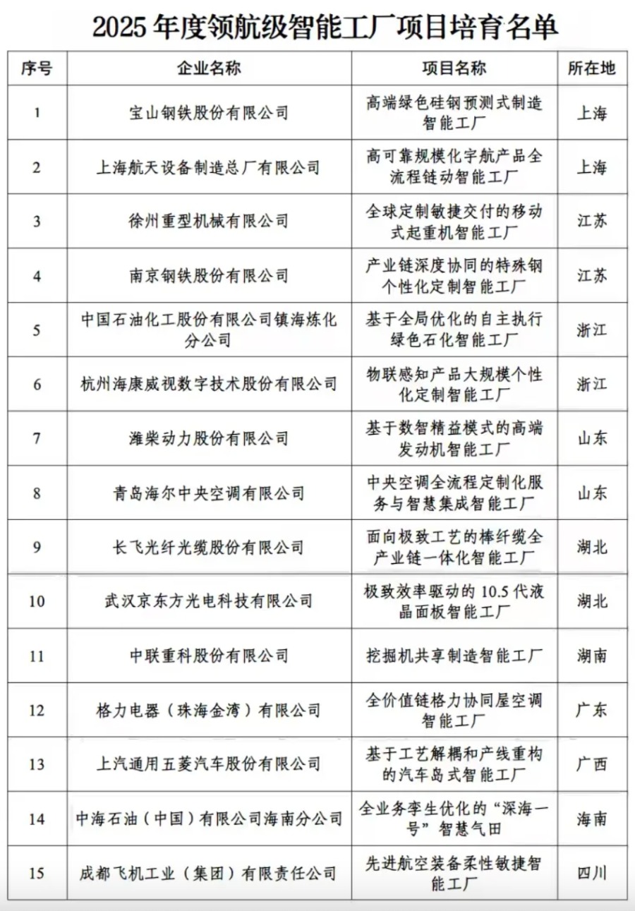 今年入選的15家領(lǐng)航級(jí)智能工廠分布于裝備制造、原材料、電子信息、消費(fèi)品等關(guān)鍵行業(yè),它們以領(lǐng)先實(shí)踐展現(xiàn)中國(guó)智能制造的廣度與深度。