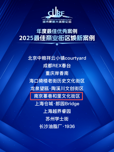 近日,2025城市更新大資管論壇(第八屆)在蘇州圓滿落幕。論壇匯聚全國城市更新領域專家與團隊,共同探討了“經濟可持續的高質量城市更新發展”熱點話題,并從民生福祉、功能價值、文化傳承、可持續運營等多維度評選年度優秀案例。其中,南京玄武區蓁巷和里文化街區項目獲得“2025最佳商業街區煥新案例”榮譽。